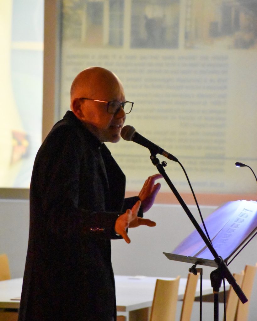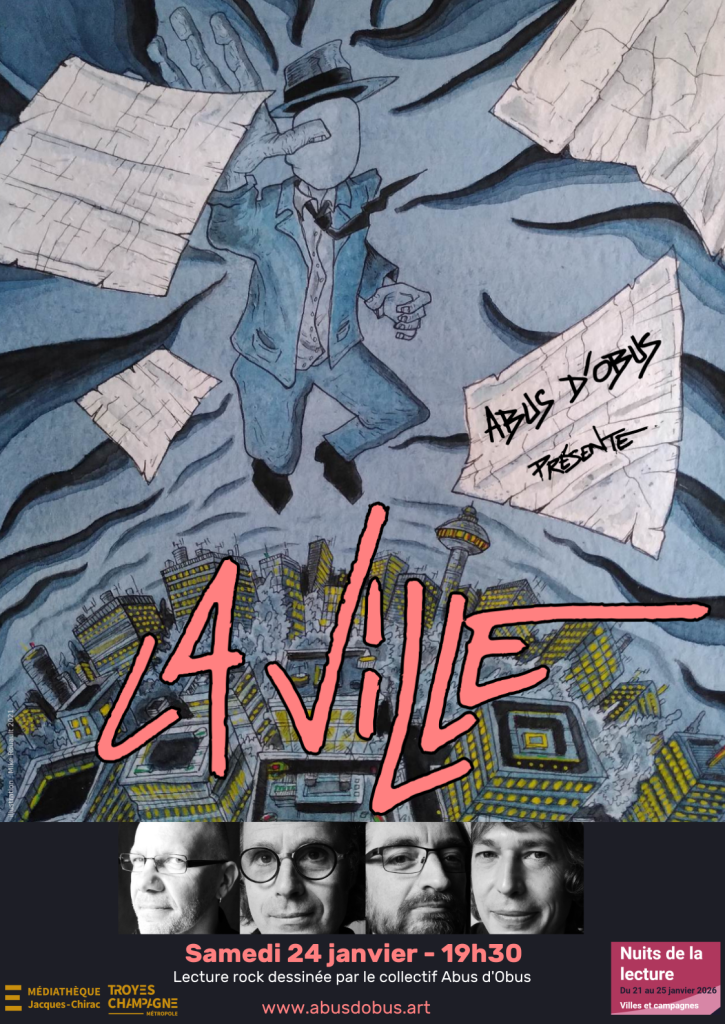C’est la rencontre improbable d’un batteur muti-instrumentiste, d’un comédien metteur en scène, d’un guitariste blues et d’un plasticien-graphiste réunis autour d’un même projet: ouvrir la Poésie au plus grand nombre par le truchement de la musique, des arts visuels et du théâtre. Aucune pose pompeuse ou intellectuelle dans cette démarche. juste le plaisir d’ouvrir un peu plus le prisme de la lecture poétique et de casser les préjugés concernant des textes classiques ou contemporains jugés difficiles. C’est dans cette farouche volonté de défrichage ludique qu’Abus d’Obus se positionne.